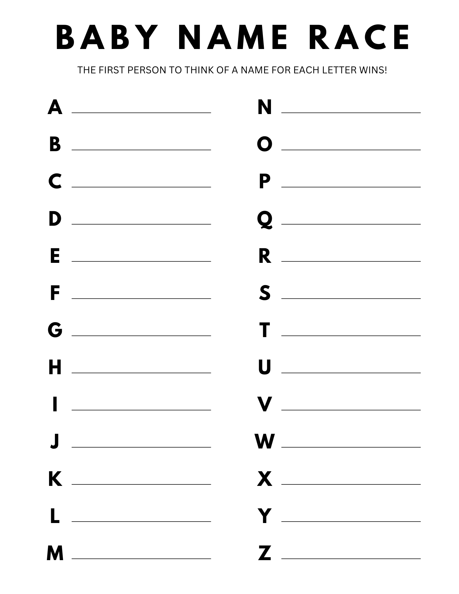 This Baby Name Race game is sure to be a hit! With it's minimalist design, it is perfect for any baby shower theme!